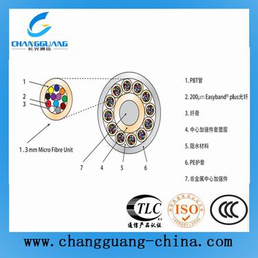 產(chǎn)品特點(diǎn):采用200μm的B6a2光纖,構(gòu)建小型化的12芯光纖微單元,在此基礎(chǔ)上使得光纜的尺寸得以小型化。這種光纜結(jié)構(gòu)可以使144芯以下的全系列氣吹微纜均可以使用12/10以下規(guī)格的常用微管。解決了傳統(tǒng)層絞式大芯數(shù)氣吹微纜的直徑超過了12/10規(guī)格微管所允許的最大微纜直徑的問題,也使得其它芯數(shù)的微纜可以采用更小規(guī)格的微管進(jìn)行氣吹敷設(shè),從而提高了管道中的光纖敷設(shè)密度。